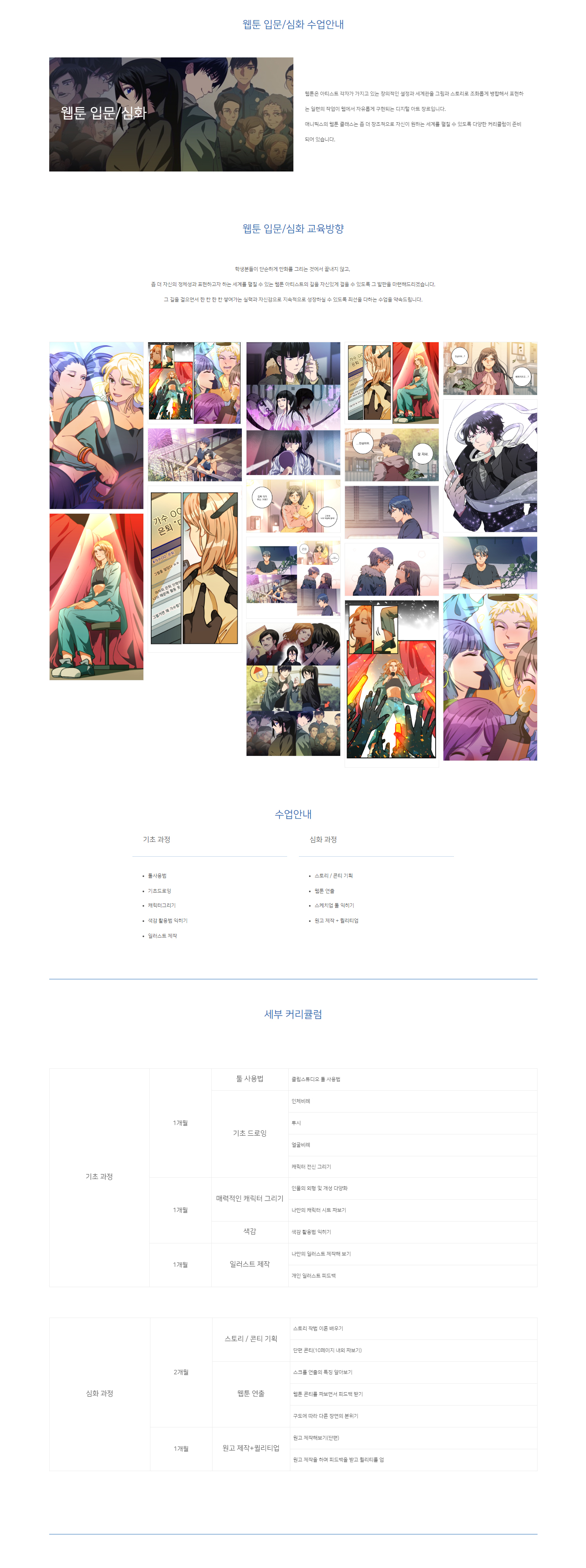 캐릭터 디자인 시트 ,콘티 , 뎃생 작화 채색까지 웹툰 한편이 완성되는 시점까지 진행되는 코스입니다.
